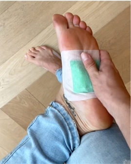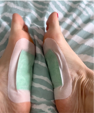 2. Apply the patch to the middle of a cleaned foot with the soft side of the patch touching the skin
